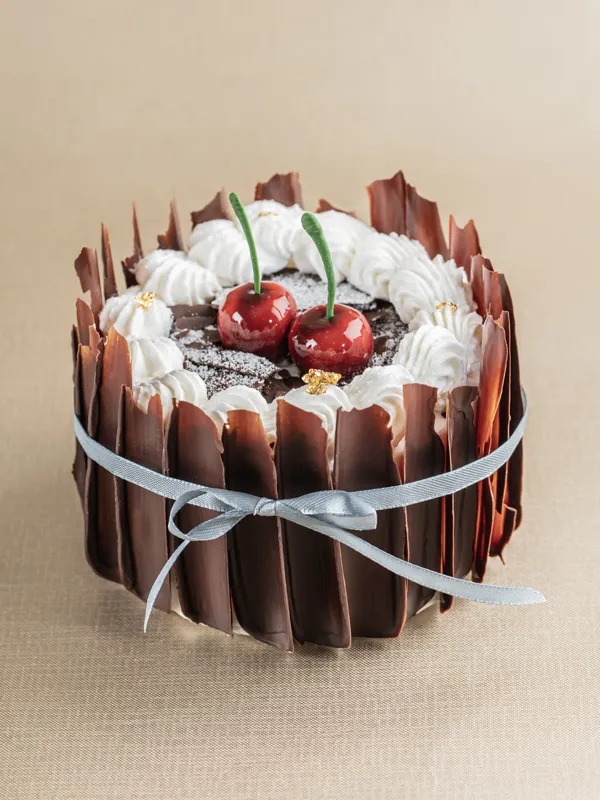巧克力海绵蛋糕, 70%巧克力慕丝, 樱桃馅, 樱桃白兰地忌廉, 巧克力碎片, 樱桃慕丝, 金箔